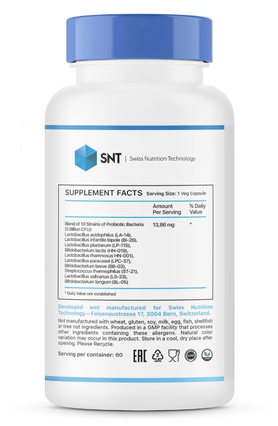 Пробиотическая смесь от SNT содержит 10 активных и клинически изученных штаммов пробиотиков. Исследования подтверждают, что пробиотические штаммы в составе пробиотика SNT чрезвычайно устойчивы к низким уровням pH и воздействию факторов желудочно-кишечного тракта (например, кислоты, желчи, пепсина и панкреатина), а также закрепляются на клеточных линиях кишечника.